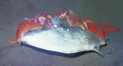 We continued on, and discovered quite a few Molas, about 18" long and 14" tall, lying on the bottom covered with Bat Starfish. The Molas weren't dead, as their pectoral fins would flutter, but they sure seemed like it. You could pick them up, and they were stiff as a board. We weren't sure what was going on.