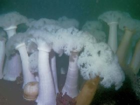 For this dive we surface swam out past the kelp, then dropped down and headed off on a compass bearing. Visibility wasn't nearly as good as the previous dive, more like 15 feet. Although I'd never seen a Metridium or even a picture of one that I knew of, they were easy enough to identify when we came to them. They were about 16" tall, with stalks several inches in diameter and heads six inches or so across. I kept expecting Alice or the Mad Hatter to show up.