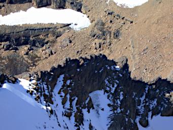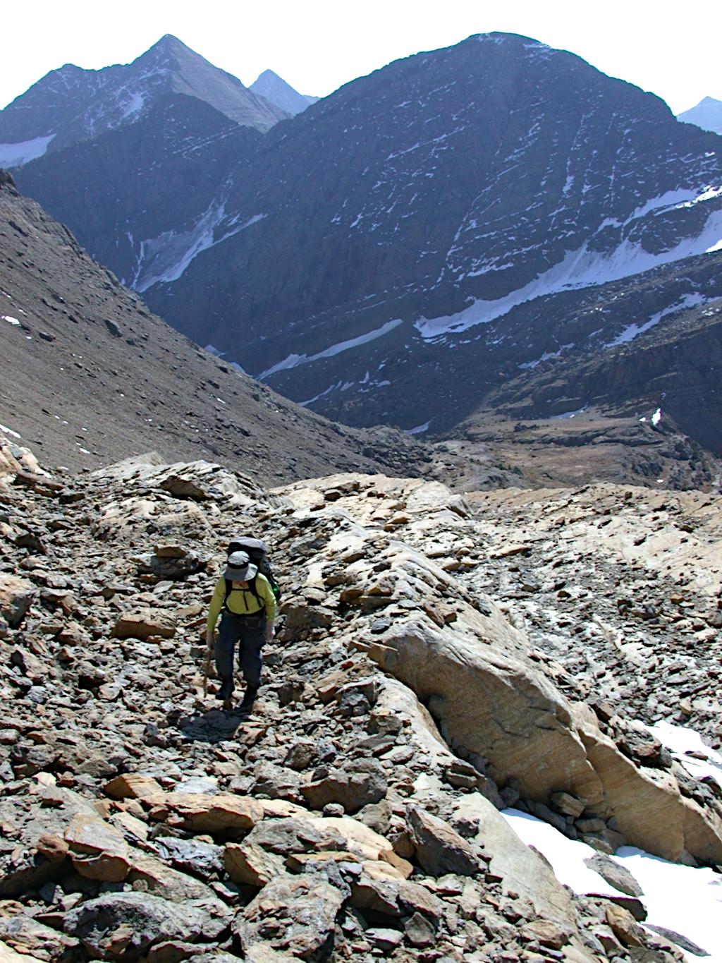 We got a good night's rest and a liesurely start. As we were getting ready to leave camp, two guys came hiking up, headed the same way. They were in high gear... We scrambled up to a bench along the bottom of the east face and followed it over towards Icefloe Lake, then contoured around Icefloe and up towards the Ashley Creek divide. From there we could see the south face. We hid behind some rocks in the sun to warm up and grab a bite to eat, and planned our route up. As we watched, we could see the two guys who went by us in camp as they approached the summit. I don't think either of them did much more than stomp on it, then turned around and headed back down. They passed us just as we were starting up.