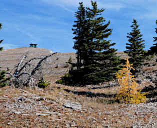 As we topped the last rise and Silvertip came into view, we could see the last larch tree, and then the last tree, and then the fire lookout on the top. I had been thinking we would tie our horses in the last grove of trees and walk to the top. But since I knew outfitters took people on horses up to the top I figured there was probably some kind of hitching rail outside the lookout. We'd come this far and the horses were still ok, although Sky was pretty pooped and sore. So we continued on up.
