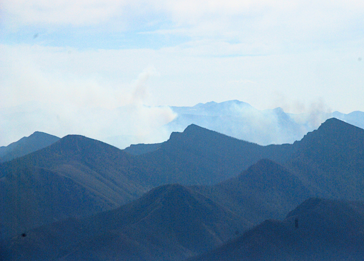 We could see smoke plumes to the south from a huge controlled burn the Forest Service was doing along the South Fork of the Sun, and the burn over in our backyard on Macabe near Monture Creek. We could see plumes from the Big Salmon Lake fire, and a couple of others. The fire break for the big prescribed burn to the south was just the ridgelines. We could see a plume where the fire had gotten out of it's prescribed area, and a chopper was doing a swing around the fire to see how it was going.