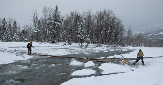 We needed an abutment on the far side as well, as the end of the log was down in the water overflowing along the gravel bar on the far side of the river. We were at the narrowest spot around, but because of anchor-ice build-up on the river bottom and surface ice build-up around rocks, the water would back up and overflow in other areas; in this case, most of the gravel bar. However, I figured we might need two of us to get a large enough log down to the river. Andrea's boots weren't high enough to wade across, so that would have to wait.