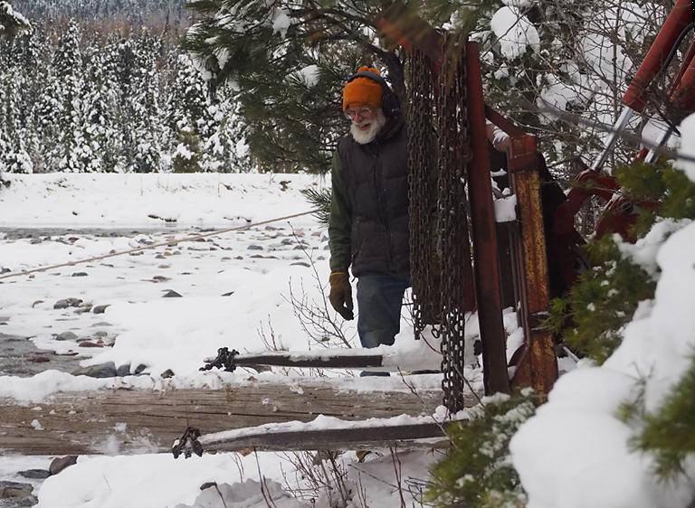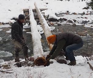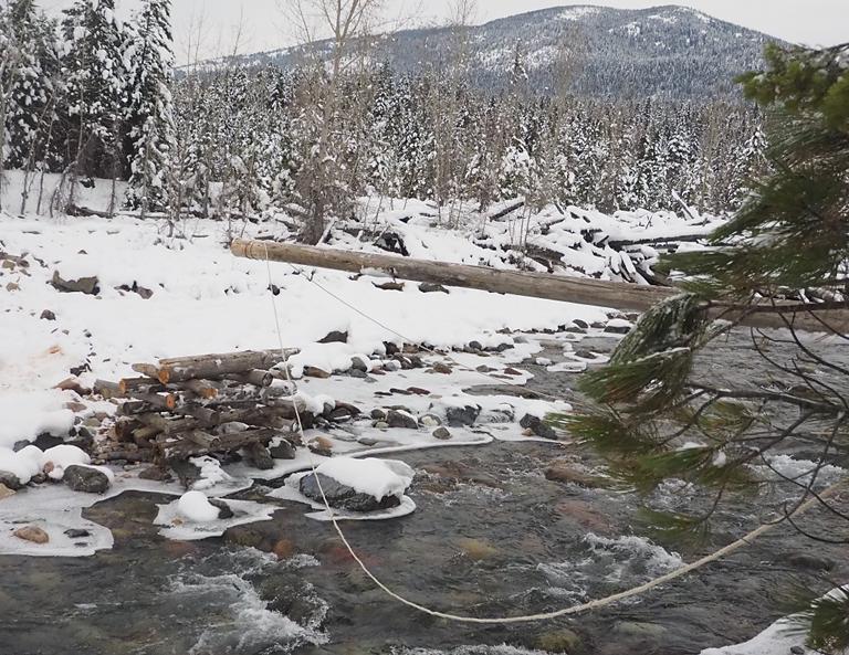 I usually make a bridge across the river in late October or early November, before we have any permanent snow on the ground. Most years we have a snow or two in September and October, but with the global warming trends we have been seeing less and less of that. I have always figured if it snowed before the middle of November we would get some warm sunny days after that to take the snow off; any snow after the middle of November marks the start of our permanent snow for the winter. This year we didn't get any real snow until November. Unfortunately, it snowed hard November 1 and we got somewhere between 10" and 14", and I had a lot of chores that should have been done before permanent snow still undone. One of them was getting the bridge in.