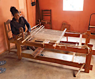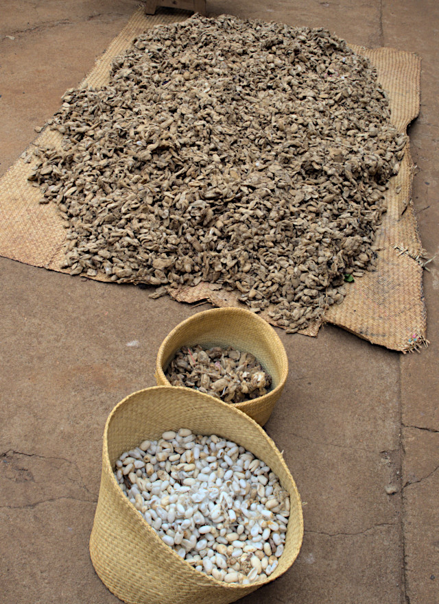 We watched women weaving native Madagascar silk at a co-op. The native "Zana Dandy" silkworm caterpillar, Borocera cajani, lives on Tapia (Uapaca bojeri) trees. Native silk is coarser than that made using Indian silkworms, Bombyx mori, which feed on White Mulberry (Morus alba) trees. Traditionally used for burial shrouds, native silk is now also used for fashion items and the tourist industry. With more demand for silk, people are trying to protect and expand tapia forests.