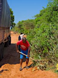In the middle of nowhere we came upon a truck blocking the road. It had some kind of drive train / gear trouble, and wasn't going to be moved anytime soon. So Caesar got out his tools and started cutting back the cactus, sisal, and other stuff so we could get around it.