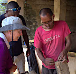 Our main focus in Ambositra was to visit some Marque://en.wikipedia.org/wiki/Marquetrytry artisans. Madagascar is well-known for its marquetry, and Ambositra is the center of the work. Since Dona creates marquetry herself, using it to accent lamps, boxes and other useful pieces, we wanted to see some of the local artisans at work. Dona uses the double bevel technique, with thinner veneers than we saw being used by this artisan, who was using the window method. The work he produced was wonderful. My diary days "Marquetry — Nary," I don't know if that is the artisan's name or just the name of the shop. In any case, he told us he started at the age of 20, and has been doing it for 31 years. He used primarily three woods: Madagascar Rosewooder (Dalbergia baronii, D. louveli, D. maritima)a>, Palisander (Dalbergia madagascariensis), and another wood whose name I didn't get. The "other" wood was put in mud for either hours, days, or a full month to get different color shades — red, green, and colors in between.