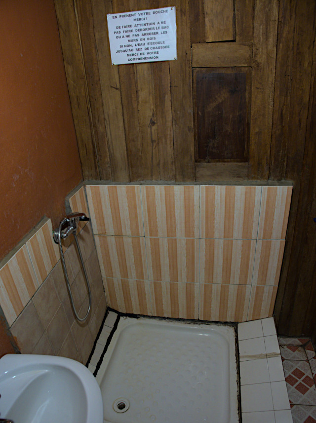 Our room and much of the hotel contained Zafimaniry woodwork; wood pin hinges on doors, wood latches, etc. A shower sign implored us to avoid getting the surrounding wood wet.