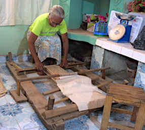This artisan was amazing. We asked how he got started, and he told us that because of a disability he could not help in the rice fields. (Notice his crutches leaning against the wall beside him.) So he searched for something else to do. It was fascinating watching him work. His hand-operated saw was crude, and wobbled some when used; it was weighted down with a stone block instead of clamped to his work table. The return spring on the saw looked to be an old bedspring. He made his own sawblades using the wire from steel belts in an old tire; he flattened them with a hammer and then cut teeth into them with a chisel, which he sharpened on a stone.