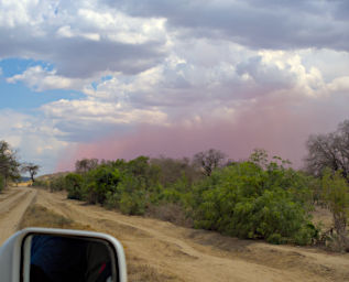 South of Tongobary we saw a big red dust storm ahead of us. We were certain we would be driving through it, so we rolled up the windows and prepared for the worst. Fortunately we only caught the edge of it and it moved on away from us.