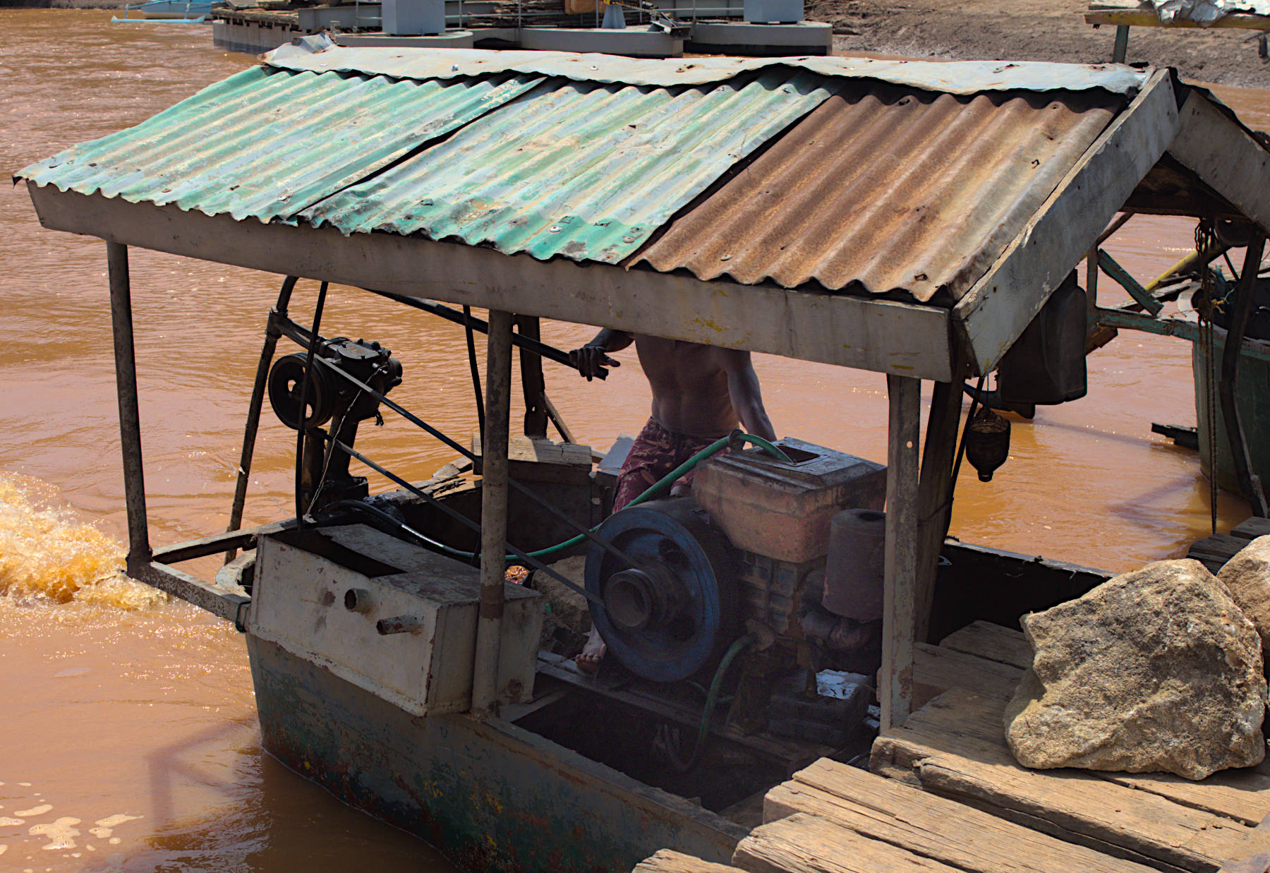 Most of the ferries are basically two big metal canoes with a platform on top, so a type of catamaran. They had to be shallow draft because the river is not very deep; but they still had to support the weight of the cars. Each hull had its own engine, a small gas engine hooked up to a flywheel and some belts going back to a gearbox that had a shaft going down to a propeller. The gas tank was a plastic jug, elevated so the carbureator was gravity fed.