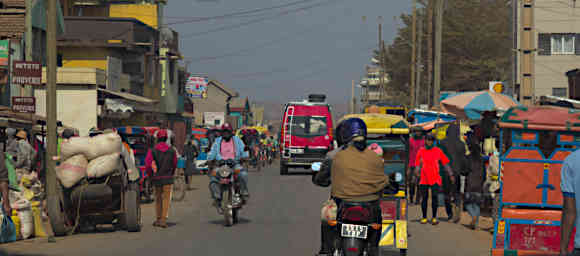 As we were leaving town we passed a transportation hub crowded with many different colored minibuses. Lova told us there was a 46% literacy rate in Madagascar, where literacy meand "read and understand numbers." Because many people can't read, the busses going to different rural communities are painted different colors.