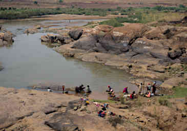 Some hours later we paddled back to the river. Some families were washing clothes and swimming below us. We surprised a young boy playing by his dugout at the base of a rock bank; he abandoned his canoe and scampered up the rock and disappeared.