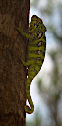 We came to the village of Beambiaty, where they raise oranges. Place names in Madagascar are descriptive. "Be" means "a lot of." "ambiaty" means oranges. Because of the orange trees, there is no burning in the town and the orange groves, so alongside the road we found a wider variety of vegetation and with it, boatloads of chameleons. In a creek bottom we saw a Yellow-Billed Kite, a Red Fody, and a Pied Crow. In another sheltered, undisturbed place we saw a Red-Tailed Vanga, Grey-Headed Lovebirds, and a Madagascar Bee-eater. We also relearned the word for white guys, "Vazama."