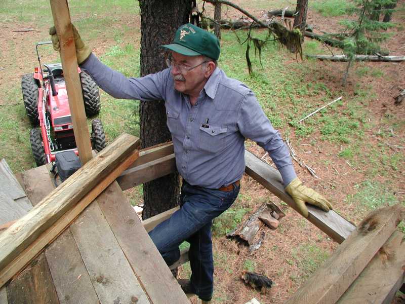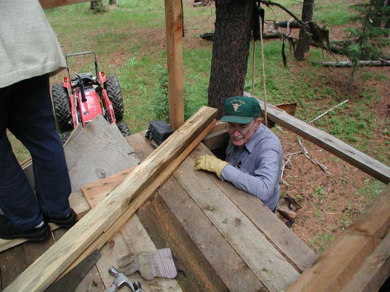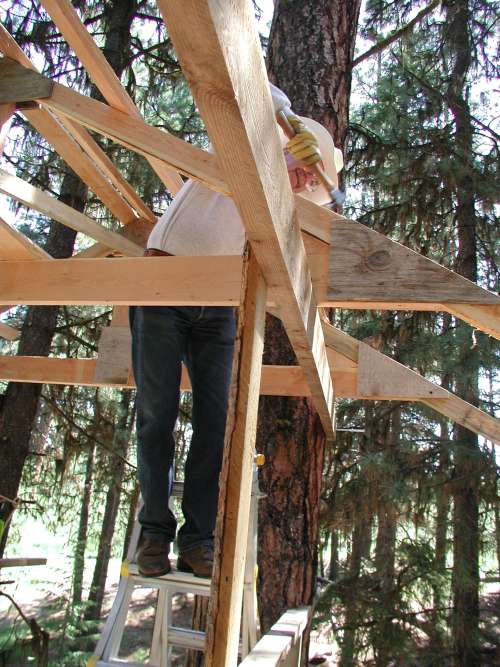 In June 2005, Lynde's mom and step dad came to visit. We spent a lot of time working on the tree house. We got the trusses for the roof up!