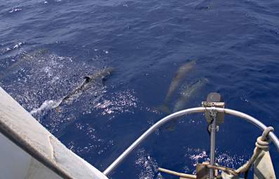 I came about and headed back; it was a fast trip. Along the way a small group of dolphins came by to say hello. I always get a kick out of watching them make fun of my slow progress as they race back and forth, weaving just out of reach at the bow.
