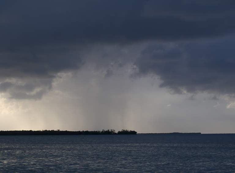 As I was passing the cut in the reef where Glory Cay used to be (a hurricane took it out), I noticed a big rainstorm brewing to the south. By the time I had cleared Southern Long Cay it stretched pretty wide and there was more to the northeast. I decided to head for clear water and the anchorage at Colson rather than mess with it between Colson and the reef. The southern squall passed to the south of me but the one to the northeast came in over Colson just as I was about to head in to anchor. So I slowed down and waited for it to come to me where I was, out in the clear. It didn't amount to much, and then I went on in and anchored.