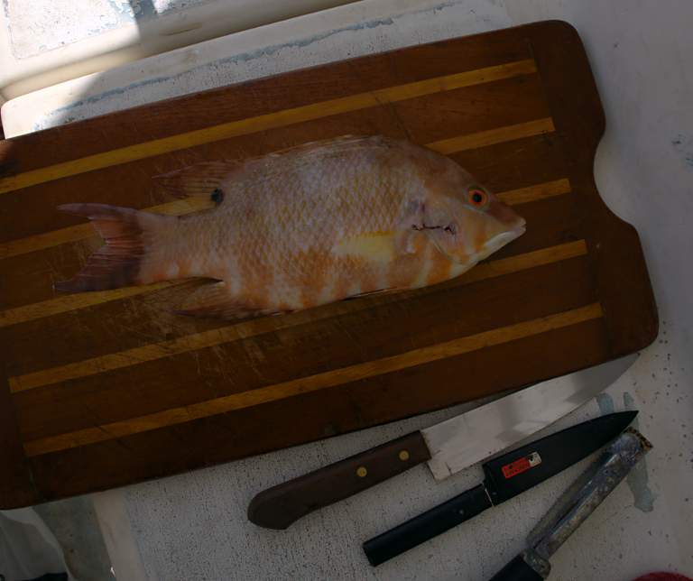 After I passed them the mask and the fellow who needed it verified that it would work for him, they offered me a lobster. I told them I thought lobsters were out of season and they said something along the lines of "Yes, but out here nobody will know." I declined, as I don't want to encourage that, but asked them if they had any hogfish. They said yes and handed me up one just the right size for dinner. A good trade all around.