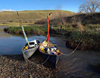 We headed for Ft. Benton on May 7th, just as the weather was turning from perfect to not-so-perfect. We got to Ft. Benton in the afternoon, and didn't get on the water until 16:23. But all the gear fit in the boats ok, and we had enough freeboard that things didn't look too dicey.