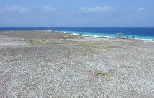 Klein Curacao is a pretty desolate island. This is looking south from the top of the lighthouse in the center of the island. The Bounty is anchored near the beach on the western shore.