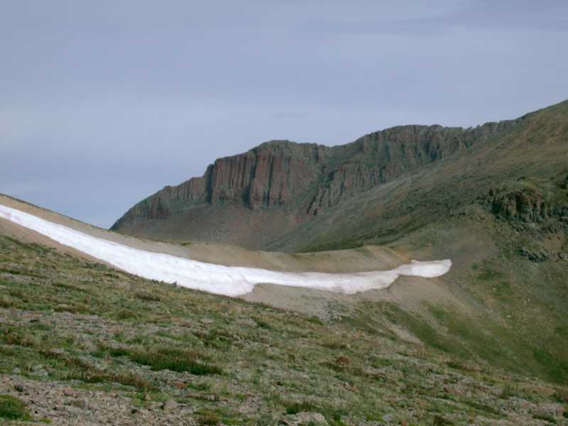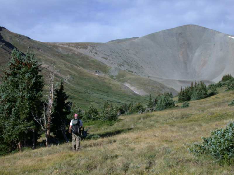 There is a small basin at the head of Stewart Creek. Once we got there, the hard part began. The trail goes up a steep hillside to a saddle, and from there along the east ridge of San Luis to the summit.