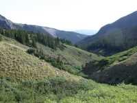 We got up way too early, just about right for starting a summit hike. After a quick breakfast of oatmeal and hot chocolate, we were off. The sun was just hitting the upper peaks. After an hour or so we were nearing the upper basin of Stewart Creek. We took a brief rest to drink and munch and thereby lighten our packs. I kept offering Erik a drink but he just sipped away from his camelback.