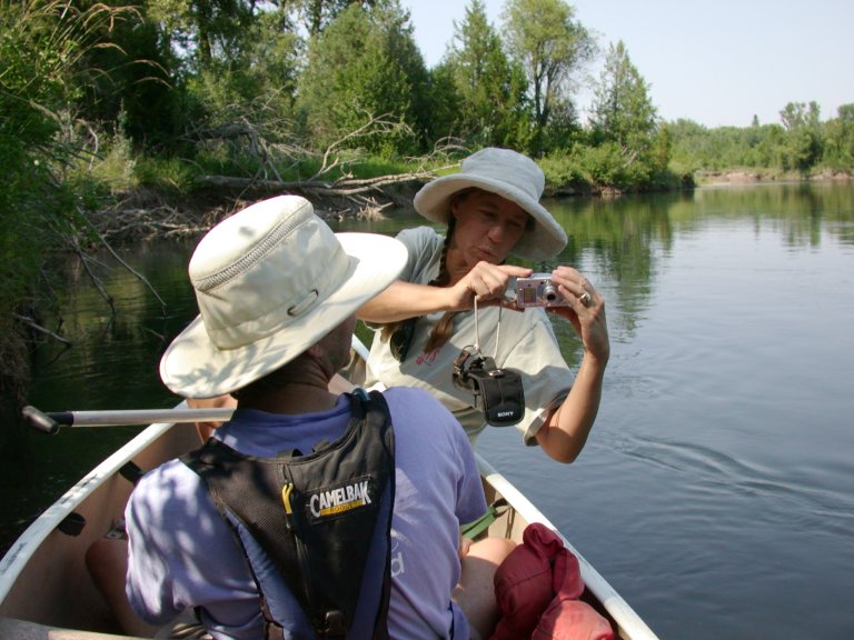 Trudy and Ian have always enjoyed canoe trips, and this July during their visit it was hot. So we took a couple of canoe trips down the Big Blackfoot. No big white-water; just the three of us and Indy in my old beater. The river is pretty crooked where it winds through the valley between where it exits the canyon below Lincoln and where it enters the next canyon. It winds through ranches where the river bottom is full of wildlife. We saw a lot of bald eagles and herons, some elk, along with ducks, geese, sandhill cranes, muskrat, and cows...
