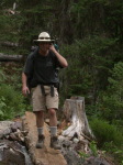 Ian, Trudy and Indy at rest overlook Lace Lake outlet Ian at Glacier Lake overlook