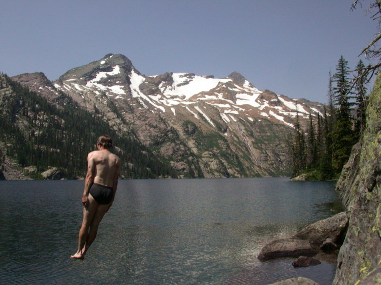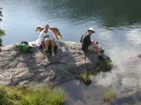 I found a nice spot on a cliff that dropped into the lake. I tried fishing, but didn't catch anything. It was getting hot, so I jumped off the cliff into the lake a few times. Ian and Trudy came over for lunch, but before we could eat Ian had to jump in too...