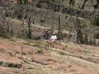 After our excursion to Jewel Lake, Ian and I had fun walking more slabs down to the outlet of Lace Lake. That's where Amber and my nephew Brian camped about ten years ago. There was a big dead tree overshadowing our camp, and it was still there. I said something as we were going to bed about it being an Ogre, and Brian said, "That's not an ogre, it's our guardian tree!" On the way back, we gound a giant lizard tree.