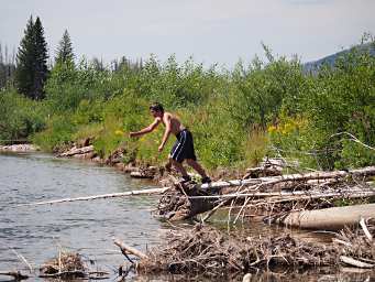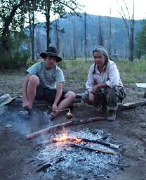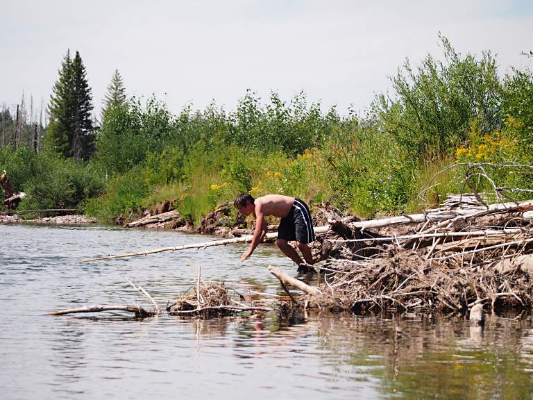We set up the silver lining as a sun-shade and lazed around down by the riverside. Adin and I fished, Dona read and made a willow basket, Andrea and Steve battled further on the cribbage board, and Zia amazed us all with the cool bugs she found. And we all went swimming and exploring.