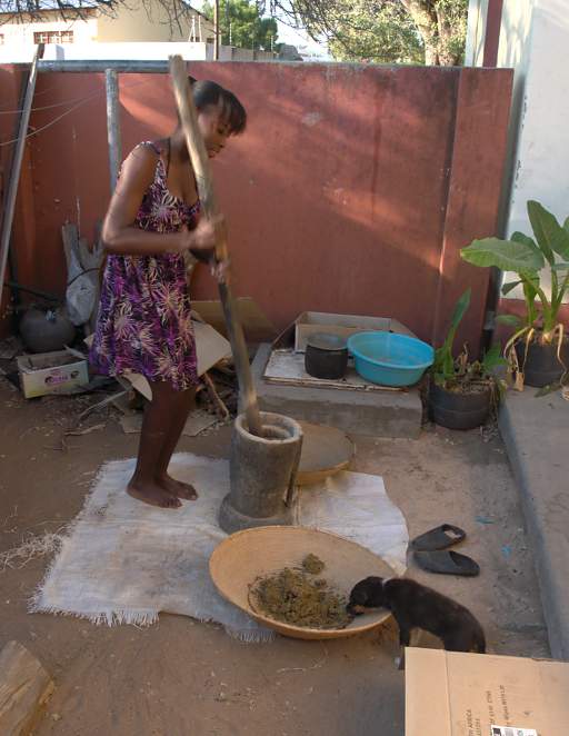 While you see ground grain of various varieties in stores, all of the families we interacted with ground their own. Many families have a small farm and typically raise millet ("Mahangu" in Oshikwanyama). The millet is ground with a mortar and pestle. The resulting flour is cooked into a cream-of-wheat like porridge.