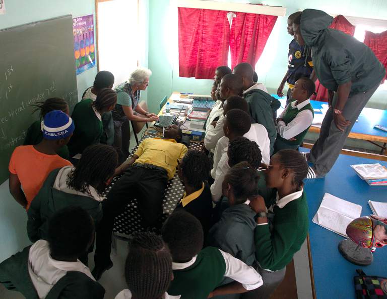 Namibian kids love to have their picture taken -- even though we didn't have a way to print the images and give them to them. They just liked to have their picture taken. One day I went to one of Dona's classes to get photos of her working with her learners. I was standing at the back of the class, and as soon as I brought the camera up to my eye one of her learners jumped up, ran up front, and put his arm around her to get in the picture.
