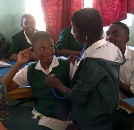 Dona brought a stethoscope and a blood pressure cuff with her. Unfortunately, we only had one of each. None of her students had ever had their blood pressure taken, or either listened to a heart or had their heart listened to. They were all eager to try them out.