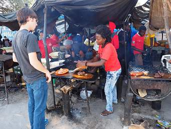 We left the mission and hitched a ride back to Oshikango, where we met up with Fletcher, Katy and Diane. Sho led us on a trip through the Oshikango open market, where we had some great Kapana and Diane and Katy again tried on clothes. Katy found one she liked and wore it out.