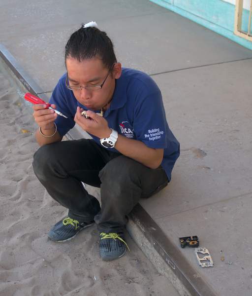 Sho had bought some new outlets to replace the non-functioning ones in the floor. Eventually I made time to take apart one of the broken ones, and discovered they were just filled with 20 years worth of sand. Did I mention it was sandy here? The power distribution panel wasn't labelled, so we didn't know which circuit breaker controlled what. The first time I started to look into one, the whole lab went dark. My first thought was "oh, dangit ..." But then Theo said he could hear the generator running over at the hospital, and it turned out there was a general power outage. Anyway, all we needed to do was take the outlets apart, clean, and reassemble. Hopefully they'll run for another 20 years.