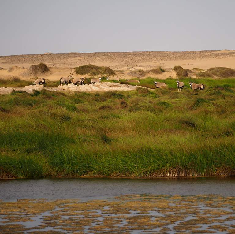The Uniab River is an oasis amid a sea of dry rock and sand.