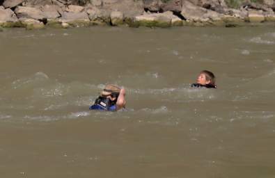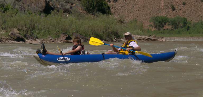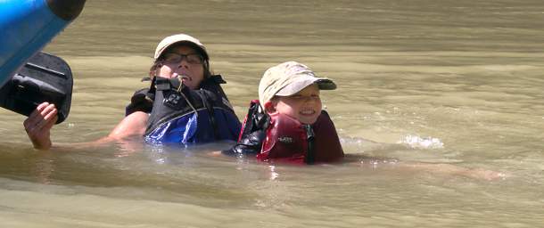 The next morning while waiting for packing the boats to be finished, Joni and Lathum practiced swimming rapids