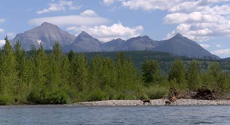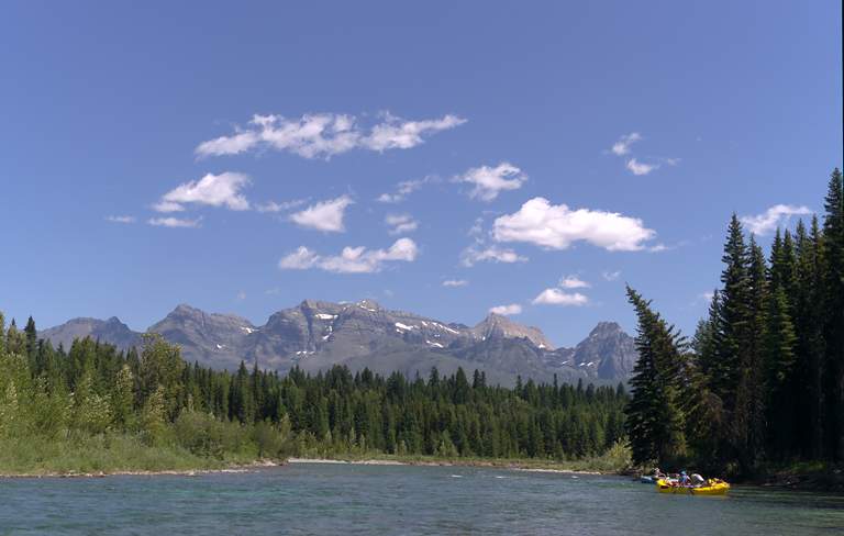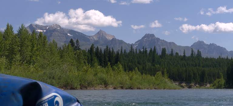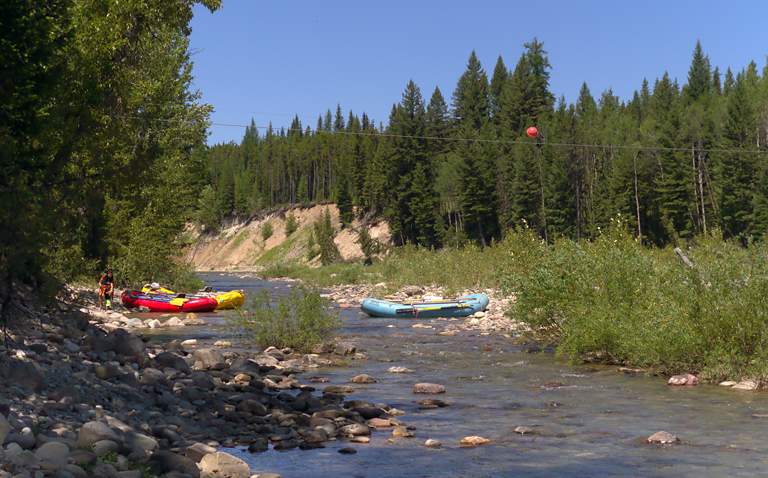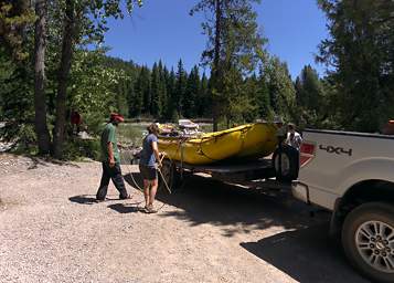 Steve and Diana drove up from Colorado, and after an overnight at our place we threw my gear into their raft and headed north.; We spent the night in the San-Suz-Ed RV Park and Campground near Apgar in Glacier, as Apgar was full. The campground itself was fine, but it is close to the highway and the train tracks so it's pretty noisy. It was a hot night — I never zipped up my sleeping bag. In the morning we picked up our shuttle drivers from Glacier Raft Co. and headed for the put-in at the Canadian border.