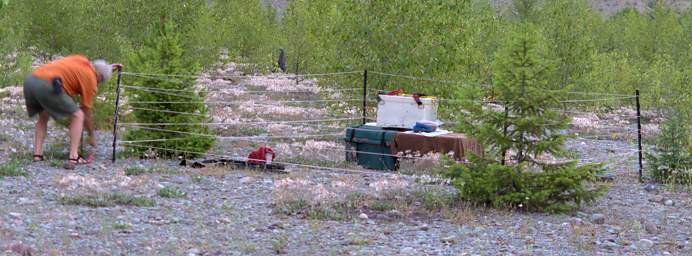 That morning we had a yearling black bear stick his nose into camp, heading straight toward the food cache inside the bear fence. Ellie saw him, emitted a low growl and started over towards him; he about-faced and headed back into the willows from whence he came. So we don't really know how well the bear fence works.