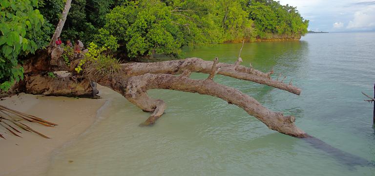The village of Saporkren is at the end of the road. Actually, it is about half a kilometer past the end of the road. There is a bus turn-around at the end of the road, and shelters for people to wait out the rain. Children heading for school or others wanting transport to Waisai walk from the village itself on a path by the sea; part of it is a wooden walkway built along a short limestone cliff.