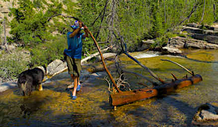 But the river was low enough at the next ford so that previous parties had placed rocks and a log so you could walk across. It looked a little woogedy so I borrowed my hiking pole back from Jack, used both poles to cross, and dumped my pack on the other side. I took Jack's pack across, then he crossed using both poles.