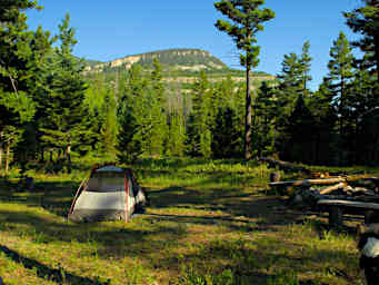 We set out the tent ground-cloth as a tarp, as I was hoping to sleep under the stars. But when it came time to turn in the mosquitos had found us so we set up the tent. It's a good thing we did; by morning there were quite a few of them buzzing around outside. As soon as we crawled into our bags we had to get out and move the tent a bit because Jack found a rock right under him.