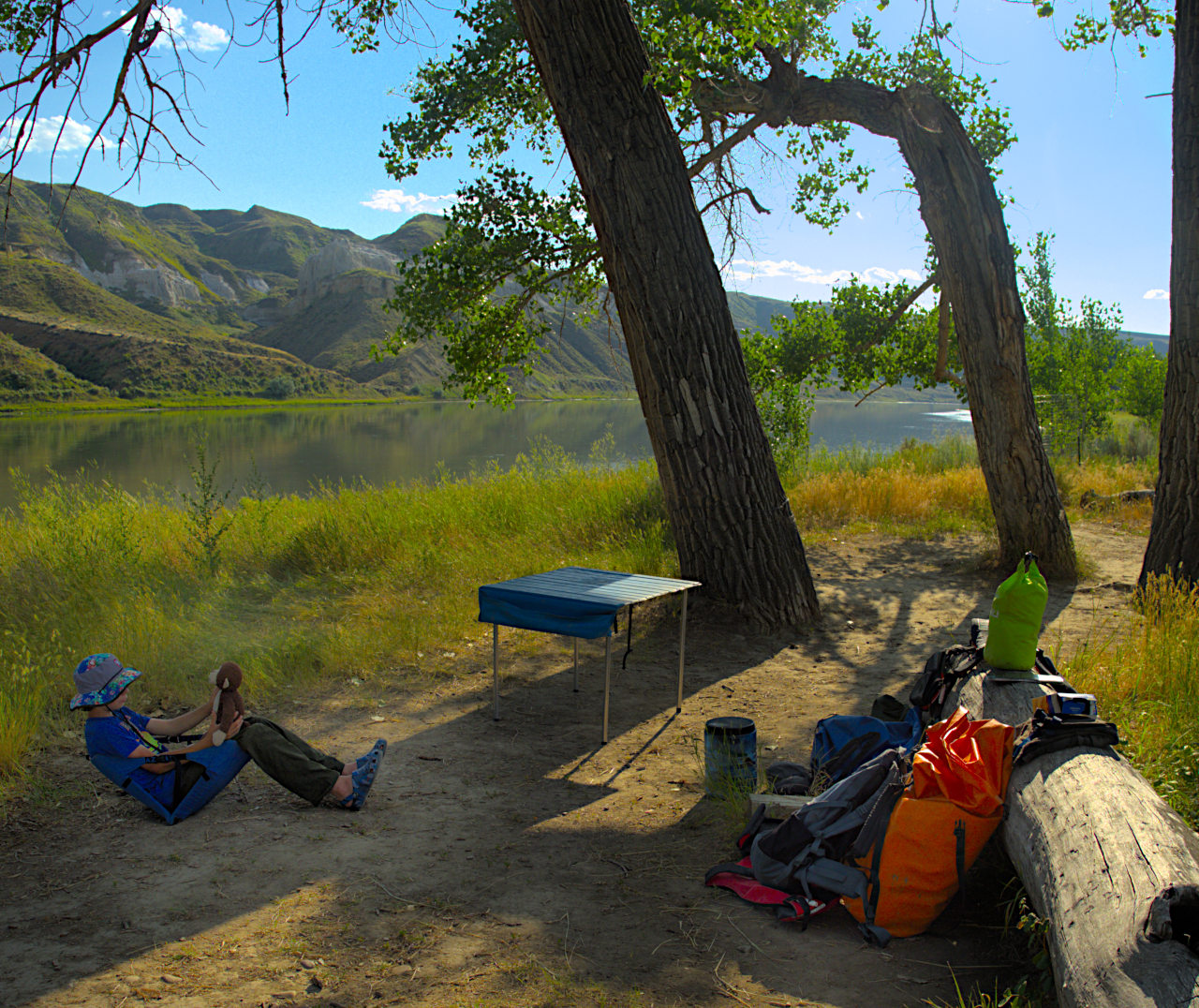 We hopscotshed down the river with a family from Bozeman looking for a camp. Their two young girls were totally at home in the water, floating / swimming with their life-jackets, crawling up on a paddleboard, or just holding on to a line dragging behind the canoe their dad was paddling. Mom was on a paddleboard up ahead most of the time.