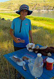 The next morning we got up at a reasonably early hour, ate a big breakfast and were off. We had an uneventful trip over the pass, around Great Falls, and into Fort Benton, where we stopped at Missouri River Outfitters and gave them a key to the car along with instructions for where to pick it up and drop it off. Then we drove to Coal Banks Landing, loaded the boat, and shoved off. We arrived at Coal Banks about 13:15, and left about 14:10; not having to do the shuttle and not having too much stuff allowed us to get on the river in short order.