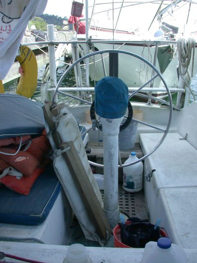 Note the arched aluminum "seat" behind the wheel, the PVC beer can holders, the PVC fishing rod holders. The two instruments on the left of the cabin face are wind speed and direction, but did not work because the instruments at the masthead were trashed.