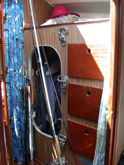 There is a hanging locker across from the head, with three drawers for storage and a shelf above. I have the drawers full of tools and repair materials. The thing going diagonally across the front of the cabinet is a fishing rod, stuck there at the time because I didn't have a better place to put it. The silver ovals are folding steps for entering and exiting out the hatch above.
