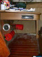 There is a good-sized nav station, something I like a lot. I like working with good ol' paper charts, and a lot of space makes that easier. Flares and such are stored under the nav station; there is also a small shelf for books or charts or binoculars, etc. The VHF radio is mounted above the nav station under the deck. The spiral cord leading to the right goes to a light. There is a combination CD player / FM radio under the nav table.