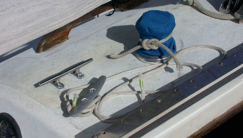 Another problem has been the lack of cleats on the cabin top. When sailing single-handed, I rig jacklines from the anchor windlass on the foredeck back to the cleats on the cabintop. I clip into these with a tether hooked to my harness, so that if I slip or get knocked about, I won't fall overboard. Or if I do, I'll at least still be attached to the boat, and hopefully able to climb back aboard. Unfortunately, Malakii only has two cabin top cleats, and if I use those for jacklines, it makes other things difficult, as there is nothing to cleat a line to after coming off the cabin-top winches. There are rope clutches ahead of the cabin-top winches, but some are broken and the rest are too small for the existing lines on the boat. Furthermore, one of the existing cabin-top cleats is an old wooden one which is screwed, not bolted, into the cabin-top, and I am not very confident of its holding power.