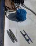 My drill is what used to be a portable one, but the handle is broken off, so the battery compartment is totally gone. It came with the boat, so I guess I can't complain. I wire it to the battery, and it works fine. When installing the cleats, the trigger popped off, something it's never done before... and landed in the water. Bummer. The water in the marina isn't crystal clear, but at least it's not horribly dirty either. I put on my mask and fins, and spent a half-hour looking for the small (about 1-1/4" long) black trigger, with no success. I finally gave up and borrowed a neighbors drill to complete the job. Around noon, I moved the boat over a foot to allow more sunlight to hit the water, and with the sun higher in the sky and the dock not shading the bottom, I tried again. On my first sweep, I found it. That was a big relief.