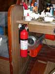 When I first bought Malakii, I was aware that she didn't have all the requisite safety equipment on board. One of the main missing items was a fire extinguisher. This didn't bother me too much, since her old gas engine has long since been replaced by a diesel. However, I did have a little excitement the first time I filled the alcohol stove. I knew enough not to try to fill a hot stove, but I thought I would be smart and fill the canister while it was sitting in the stove enclosure, a stainless sheet metal bin about the size of a two burner coleman stove and eight or ten inches deep. Seemed like a good idea, since any spilled alcohol would be contained in the bin. However, it is pretty difficult to clean up every little drop of errant alcohol, and one should wait a while for the last vestiges to evaporate. When I went to light the newly refilled stove, I had, uh, a little more flame than I needed to boil my cup of tea. And no fire extinguisher. Fortunately a towell was at hand, and I smothered the fire ok. But I did decide to get a fire extinguisher. It's now mounted next to the nav table, accessible from the galley and not too difficult to get at from the cockpit. The other orange canisters under the nav table contain flares.